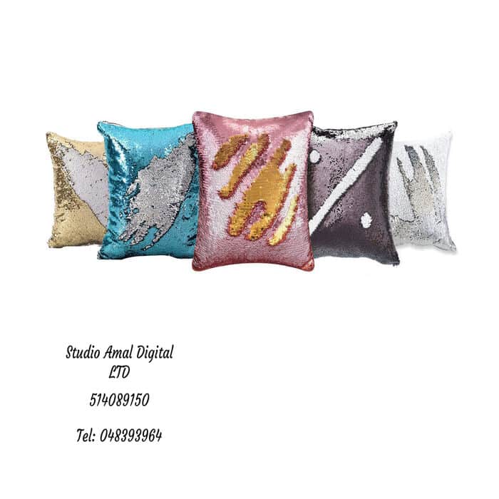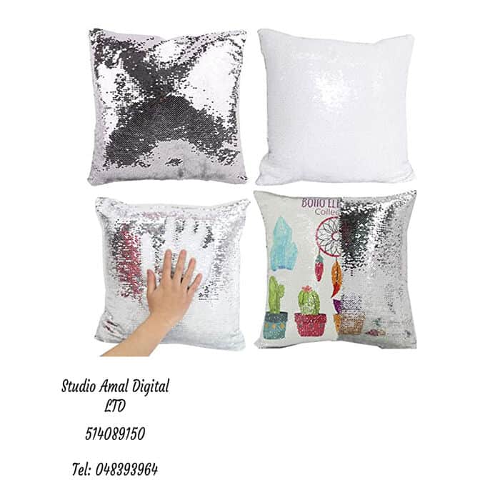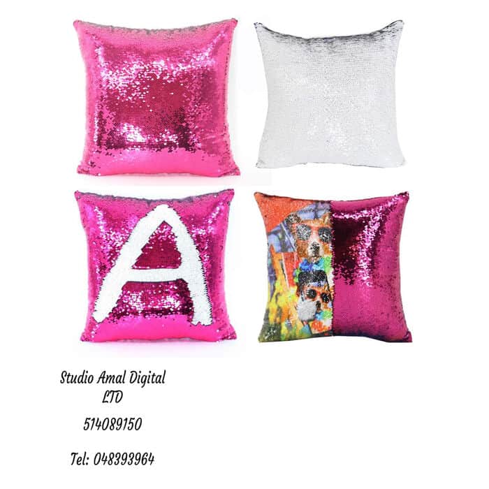 כרית פייטים מרובעת הדפסת סובלימציה בעיצוב אישי.